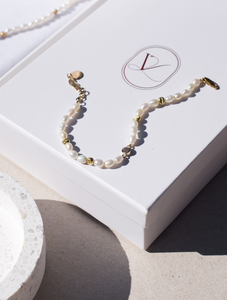 A pearl armlet with a 0.21ct diamond encased in gold with 4 gold coffee beans spread evenly between the potato pearls. This bracelet matches our Lovers Lace Choker. It could be paired with other bracelets and stands out like a diamond in the rough or go solo and be worthy of the center of attention.